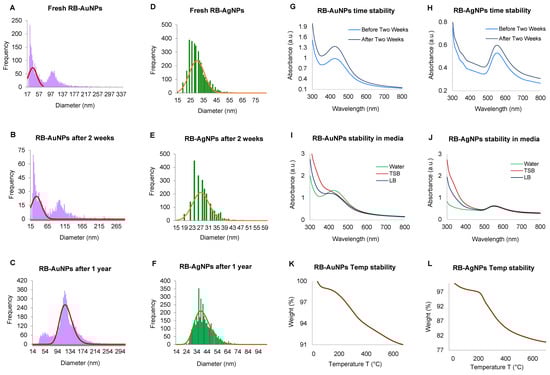 The sp-ICPMS analysis for RB-AuNPs and RB-AgNPs was performed to know the concentration and yield of nanoparticles and their stability for different time intervals. The results showed that the concentration of RB-AuNPs was 0.67 µg/µL (Figure 5A), and for RB-AgNPs was 0.65 µg/µL (Figure 5D). The same samples were analyzed at a difference of two weeks (Figure 5B,E) and one year (Figure 5C,F). The obtained results indicated the same histogram without any fluctuations, which demonstrated that the formed nanoparticles remained in the same size and concentration for up to a year, i.e., highly stable. Stability tests were also conducted using UV-Vis spectrum analysis. The time difference scanned pattern also showed a similar and overlapping peak in a difference of two weeks for RB-AuNPs (Figure 5G) and RB-AgNPs (Figure 5H). Stability results of RB-AuNPs and RB-AgNPs in different media and aqueous solutions were also conducted, and the results demonstrated that the RB-AuNPs (Figure 5I) and RB-AgNPs (Figure 5J) remain stable in all three mediums but best in water. Temperature stability analysis showed complete degradation of nanoparticles concerning increasing temperature for RB-AuNPs (Figure 5K) and RB-AgNPs (Figure 5L).
