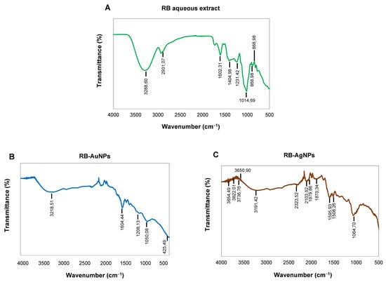RB-AuNPs and RB-AgNPs were subjected to FT-IR analysis to determine the presence of biomolecules, functional groups responsible for the reduction and capping/stabilization. The FT-IR measurements were carried out using a Nicolet iS50 (ThermoFisher Scientific, Waltham, MA, USA) by scanning the purified pellet of RB-AuNPs, RB-AgNPs, and freeze-dried rowanberries aqueous extract, (%) versus wavenumber (cm−1) [].