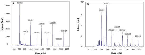 The FT-IR analysis of rowanberries extract confirmed the presence of many active groups (Figure 6A); for instance, the peak at 328,860 cm−1 corresponded to the –OH (hydroxyl group) of phenolic compounds and amine N–H/O–H stretch. The peak at 293,107 was the asymmetric stretching of a methyl group –CH3 and C–H stretching of alkanes or secondary amines []. The peak at 160,231 cm−1 represented –C=C stretching vibration in flavonoids and terpenoids and carbonyl group (–C=O) –stretching vibration of proteins or amide I, peak at 140,498 cm−1 to (N–H) stretching vibrations of proteins, peak at 123,142 to C–N aromatic amino groups, 101,469 peak to Carbonyl –C–O–C or –C–O stretching vibrations of amide linkages []. RB-AuNPs and RB-AgNPs showed overlapping peaks in similar regions, which indicated the presence of several active surface groups on nanoparticles surfaces originating from berries extract (Figure 6B,C) []. Finally, we performed the MALDI-TOF analysis to examine the protein content on the surface of the nanoparticles. The mass spectra showed a series of intense single peaks in the range between 590 and 3800 m/z (Figure 7A,B). For RB-AuNPs, several peaks could be assigned to gold ions, at 590.712, 788.005, 985.004, 1182.005, 1379.005, 1576.013, 1773.046, 1969.023, 2166.037 (Figure 7A). For RB-AgNPs, we detected several peaks assigned to silver ions of higher cationic species at 754.528, 970.378, 1186.238, 1402.087, 1617.952, 1833.817, and 2263.542 (Figure 7B) [,].
