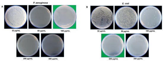 Cell viability test at different concentrations range from 32 to 300 µg/mL of RB-AgNPs for (A) P. aeruginosa and (B) E. coli. The green background shows the MBC values of respective pathogens with complete growth inhibition.