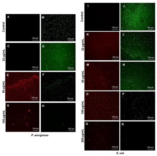 Live and dead staining of (A–H) P. aeruginosa and (I–R) E. coli, after treatment with RB-AgNPs at different concentrations. P. aeruginosa cells: (A,B) control without RB-AgNPs, (C,D) 32 µg/mL of RB-AgNPs, (E,F) 50 µg/mL of RB-AgNPs, (G,H) 100 µg/mL of RB-AgNPs. E. coli cells: (I,J) control without RB-AgNPs, (K,L) 32 µg/mL of RB-AgNPs, (M,N) 50 µg/mL of RB-AgNPs, (O,P) 100 µg/mL of RB-AgNPs, and (Q,R) 200 µg/mL of RB-AgNPs.