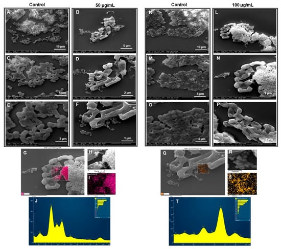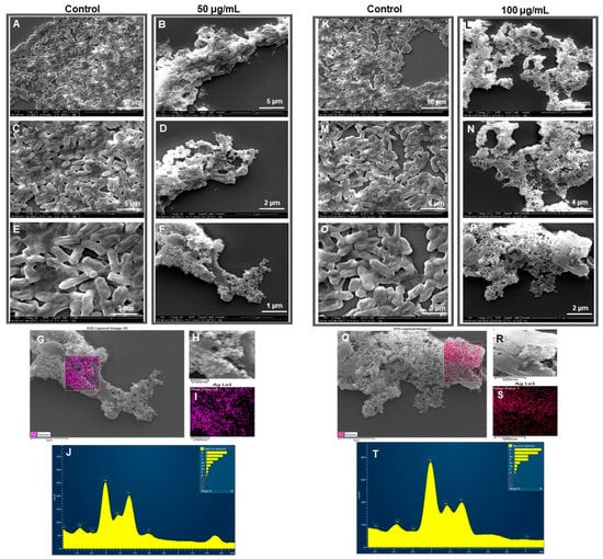 Figure 9I–R, showed a complete red region of dead cells at 200 µg/mL concentration for E. coli cells. In addition, we also checked the morphology of the dead cells by using SEM []. SEM analysis of P. aeruginosa cells treated by RB-AgNPs was done at two different concentrations, i.e., 50 and 100 µg/mL. Figure 10A–F showed P. aeruginosa cells were completely covered with nanoparticles and open membrane and structures. The same behavior was found at 100 µg/mL concentration of RB-AgNPs, Figure 10K–P. The elemental mapping results also indicated that the damaged cells were completely covered with silver nanoparticles, Figure 10G–I,Q–S, which concluded that the cause of cell lysis was RB-AgNPs. In addition, EDX demonstrated the clear pic for silver element and Figure 10J,T, which showed the purity of RB-AgNPs in damaged cells. Figure 11 showed RB-AgNPs effects on E. coli cells at 50 µg/mL (Figure 11A–F) and 100 µg/mL (Figure 11K–P) concentrations of RB-AgNPs. The EDX and elemental mapping results indicated that the cells were covered predominantly with silver elements. Thus, the damage happened due to the silver ions released from RB-AgNPs Figure 11G–J,Q–T.