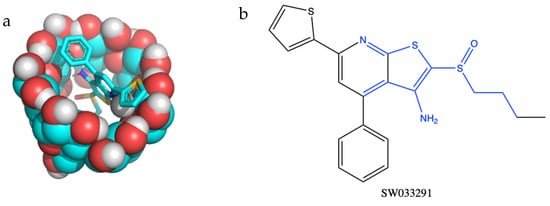 (a) Molecular structure in silico model demonstrating inclusion complex formation between the small-molecule drug SW033291 binding to the inner pocket of β-cyclodextrin. (b) Regions of SW033291 in blue are complexed within the cyclodextrin ‘pocket’.