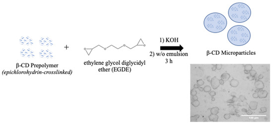 Overview of β-CD microparticle preparation. β-CD prepolymer is crosslinked with EDGE for 3 h at elevated temperature (60–70 °C) and formed in a water/oil (w/o) emulsion.