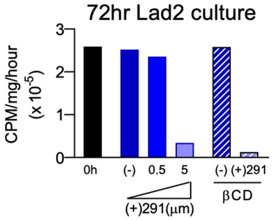 To confirm drug activity after delivery from β-CD MPs, (+)SW033291 activity was analyzed in vitro by proxy of analyzing supra-physiological concentrations of Lad2 enzyme activity inhibition. Using Method A, with uncrushed particles (final loading concentration: 11.9 mg/mL), we found that β-CD MP-released (+)SW033291 was effective at reducing LAD2 enzyme activity comparable to 5 μM free drug after 72 h (Figure 4). LAD2 controls and LAD2 treated with unloaded β-CD MP controls saw unremarkable changes in enzyme activity, confirming that β-CD alone does not contribute to enzyme inactivation. Drug release kinetics were also observed to exhibit increasingly zero-order kinetics compared to bolus administration, confirming that β-CD MPs slowed the rate of release of (+)SW033291 over a three-day period (Figure S2).