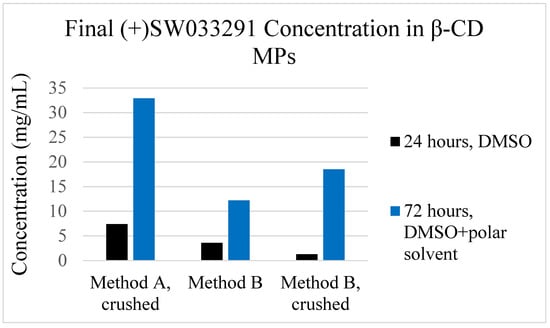 Final loading concentrations for β-CD MP formulations utilizing a ‘24-h’ loading protocol and our investigated ‘72-h’ loading protocol, which uses loading solution of both DMSO and a polar solvent (water) to help drive complexation (referred to as “DMSO + polar solvent”).
