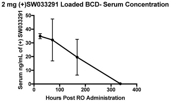 Serum (+)SW033291 concentrations collected from mice (n = 4 at each timepoint) following RO administration of (+)SW033291 loaded β-CD MPs. Error bars are representative of the standard error of the mean.