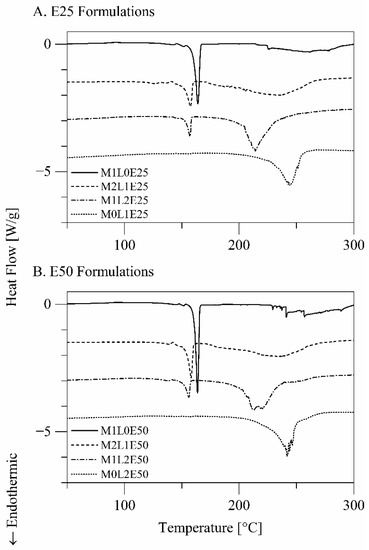 The differential scanning calorimetry thermograms of the formulations are presented in Figure 2. The formulations M1L0E25 and M1L0E50, which are composed of terbinafine hydrochloride and only mannitol as an excipient, exhibited a minor endothermic–exothermic transition at 140–154 °C and a sharp endothermic transition with Tpeak = 163.83 ± 0.40 °C. The transitions, respectively, suggest that mannitol was present in the δ- and the α/β-crystalline forms in these formulations [19]. The formulations M0L1E25 and M0L1E50, which are composed of terbinafine hydrochloride and only leucine as an excipient, exhibited a broad endothermic transition with Tpeak = 244.33 ± 2.43 °C, which corresponds to sublimation of l-leucine [20]. Combining mannitol and leucine as excipients in the formulations M2L1E25, M1L2E25, M2L1E50, and M1L2E50 shifted the endotherms corresponding to melting of δ- and α/β-mannitol and the endotherm corresponding to sublimation of l-leucine to lower temperatures. The mutual destabilization can be a result of mixing, where each excipient acted as an impurity in crystals of the other excipient. None of the formulations exhibited the endothermic peak characteristic of melting of crystalline terbinafine hydrochloride (Tpeak = 200–205 °C [6]), suggesting that terbinafine hydrochloride was amorphous in all the formulations. The differential scanning calorimetry data do not suggest that the spray solvent composition influenced the crystallinities of the formulation ingredients.