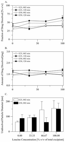 Disintegration and dissolution of the particles of the formulations are described in Figure 3. After dispersion of a dose into the disintegration medium, the excipient/s completely dissolve, whereas the drug partially dissolves. Plotting the fraction of the drug dissolved versus the concentration of leucine in the formulation (Figure 3A) implies that dissolution of the drug was influenced by the excipient composition. However, the differences between the fractions of the drug dissolved only reflected the differences between the drug concentrations in the formulations (see Table 2). Plotting the amount of the drug dissolved versus the concentration of leucine in the formulation (Figure 3B) makes it clear that neither the excipient composition nor the spray solvent composition influenced the amount of the drug dissolved after 2 min (two-way analysis of variance: p > 0.05). Changes in the amount of the drug dissolved with time were minor. It is plausible to conclude that dissolution of the drug was governed by saturation of the dispersion medium with the drug and that saturation was reached shortly after dispersion. For all the formulations, the average diameters of undissolved drug particles (Figure 3C) were smaller than 200 nm over the duration of the experiments.
