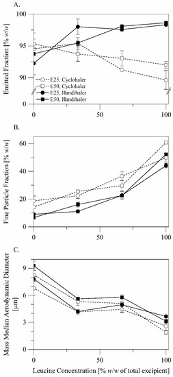 Using leucine in the current study as an excipient resulted in wrinkled particles with irregularly dimpled shapes (Figure 1, Section 3.1.2), consistent with the known spray drying behavior of leucine, suggesting that leucine contributed to the formation of crystalline (Figure 2, Section 3.1.3) particle shells. Using leucine as an excipient consequently resulted in particles with smaller aerodynamic diameters (Figure 5, Section 3.2.2). As the concentration of leucine in the formulation increased, the fine particle fraction and the fine particle dose of the formulation considerably increased, despite that the drug load decreased. The decreased drug load may be a consequence of particle fragmentation and surface perforation.