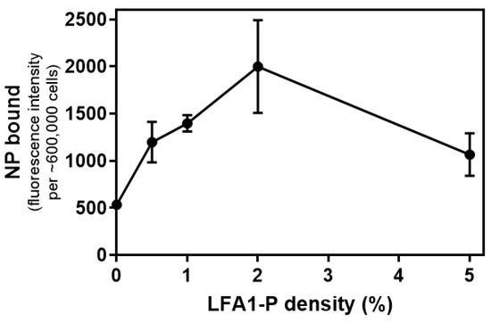 Effects of LFA1-P density on 4T1 cellular uptake of indocyanine green (ICG)-labeled NPs. 4T1 cells were seeded on a 12-well plate (300,000 cells/well) and incubated overnight. ICG-labeled NPs with 0.5%, 1%, 2%, and 5% LFA1-P of 0.5 mM (lipid concentration) were added into wells, and plates were incubated at 4 °C for 1 h. ICG fluorescence intensity was measured in a micro-plate reader, and the values are presented as mean ± SD of the replicates.