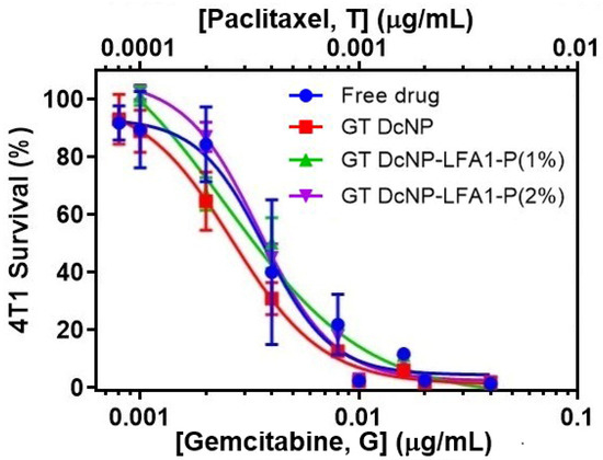 Dose–response curves of different drug combination dosages on 4T1 cell viability. Cell viability was evaluated by an Alamar Blue metabolic cell viability assay after 3 days of incubation with the GT DcNP, GT DcNP-LFA1-P, or free drugs as a GT combination. The G and T (fixed w/w ratio at 10:1) concentrations in the combination are indicated by the bottom and top x-axes, respectively.