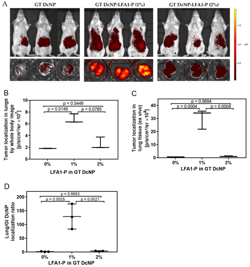 Six-week-old, female BALB/c mice were used in the targeting study. 4T1 cells transfected with luciferase and green fluorescence protein (GFP) (4T1-luc) were used for bioluminescence detections [8]. 4T1-luc (2 × 105 cells) was suspended in 100 µL ice-cold HBSS and intravenously inoculated through mouse tail veins. The mice were inoculated with 4T1 cells and given a single IV dose of either a GT DcNP, GT DcNP-LFA1-P (1%), or GT DcNP-LFA1-P (2%) formulation on day 0 (n = 3). Mice and tissue imaging was conducted on day 10. The mice received 150 mg/kg of D-luciferin through intraperitoneal injections 10–15 min before imaging. Bioluminescence imaging parameters for living mice and tissue were set as follows: field of view, 12; excitation filter, closed; emission filter, open; exposure time, 120 s (living mice) and 60 s (lung tissue); binning factor, 4; f/stop, 2. Total 4T1-luc bioluminescence emissions from the living mice were integrated using Live Image software (PerkinElmer, Waltham, MA, USA).