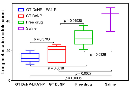 To investigate whether the ICAM-1-targeted GT DcNP-LFA1-P can improve overall therapeutic outcomes of GT DcNPs, we evaluated the effect of GT DcNP-LFA1-P on inhibiting 4T1 lung metastasis. The mice inoculated with 4T1 cells were given a single IV dose of GT in the CrEL, the GT DcNP, or the GT DcNP-LFA1-P forms. A low GT dose (5/0.5 mg/kg) was chosen to discern the targeting effect of the GT DcNP-LFA1-P for GT DcNPs, as this dose was previously shown to partially inhibit 4T1 lung tumor formation when given in the GT DcNP dosage form [8,9]. We treated 4T1 mice at 3 h post-tumor-inoculation with an intent to discern the targeting of LFA1-P in GT DcNPs, compared to that without LFA1-P (i.e., GT DcNPs alone) and evaluated the formation of lung metastasis nodules at day 14. The 4T1 breast cancer expressed luciferase, which allowed the tracking of tumors based on the luciferase bioluminescence signal intensity. As the model was to mimic the condition of the remaining metastatic cells advancing through blood to distinct sites (lungs) after surgery, the primary tissue (mammary gland) was not examined (because no cancer cell was implanted). As shown in Figure 6, a single dose of the GT DcNP or the GT DcNP-LFA1-P could significantly inhibit the establishment and growth of 4T1 metastatic cancer in the lungs more than free drug combinations (CrEL) or a saline control. The GT DcNP-LFA1-P exhibited a trend toward more tumor than the GT DcNP (by 11%). Due to the small sample size, the data variation did not reach statistical significance (p > 0.05). However, compared to free GT, the GT DcNP-LFA1-P exhibited highly significant treatment effects (p = 0.01; GT DcNP-LFA1-P vs. free drug), and a lower degree of significance for GT DcNPs (p = 0.04 GT DcNP vs. free drug). Furthermore, the ex vivo metastatic lung images taken by a dissection microscope also indicated less and smaller nodules by the GT DcNP-LFA1-P group than the control group (Supplementary Information, Figure S3).