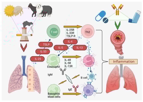 Asthma is a type 2 immune disorder that is classified phenotypically, with eosinophilic, neutrophilic, mixed granulocytic, and paucigranulocytic subtypes that are distinguished by sputum analysis for immune presence [5]. Three chief phenotypes are currently recognized: inflammation mediated by eosinophils (late-onset, early-onset), obesity or smoking-associated (lifestyle), and allergic hypersensitivity in the trachea or bronchial airways [5]. Remodeling of the respiratory tract, with excessive fibrosis and scarring from collagen deposition, occurs due to chronic inflammation, and this process is irreversible [6]. It is thus imperative to rapidly reduce inflammation within the airways as well as prevent errant activation of the allergen hypersensitivity mechanism. Genetic components play a role, with protective transforming growth factor-β (TGF-β) signaling mutations having been reported, but, in general, avoidance of pet dander, plant pollens, dust, pm2.5 pollution, ozone, and cold air are also required to minimize reactive airway hypersensitivity (Figure 1) [7,8].