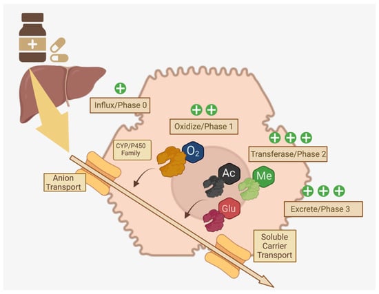 Multi-Phase Drug Metabolism in Hepatocytes. Distinct phases of drug metabolism that increase polarity through enzymes that modify xenobiotics via addition of functional groups are crucial for excretion of ingested medications [25,28,29,32]. Created in BioRender.com.