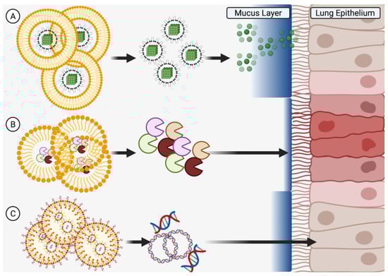 Customized Delivery Systems. Liposomes (left), nanoparticles (center), and exosomes (right) can be tailored to penetrate into the deepest parts of the lung and deliver therapeutics directly to epithelial cells through the mucus layer. Created in BioRender.com.