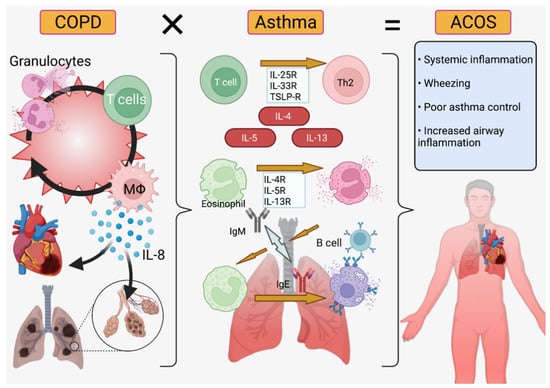 Asthma-COPD Overlap Syndrome (ACOS). Chronic obstructive pulmonary disorder (left) is primarily IL-8/neutrophil mediated while asthma (center) is IL-4/5/13 and T-cell mediated ACOS (right) features symptoms from both diseases and requires increased inflammation control [16,17,176]. Created in BioRender.com.