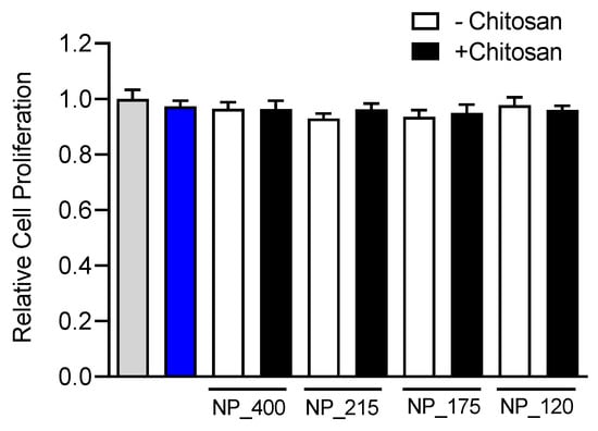 Prior to investigating any novel nanoformulation in functional assays its potential for cytotoxicity must be evaluated. While chitosan has a favorable safety profile [43], a size dependent effect of chitosan nanoformulations on cytotoxicity has been observed [44]. Further, simvastatin has been demonstrated to significantly attenuate proliferation at doses above 10 µM in a cell-type dependent manner [45]. Thus, we evaluated the effect of free simvastatin or our nanoformulations on proliferation of HT-29 mucosal epithelial cells. Cells were cultured in the presence of free simvastatin (10 µM) or of a 10 µM equivalent amount of each simvastatin-loaded NP formulations for 1 h and subsequently cultured in culture media alone without drug or NPs for 3 days. There was no significant difference in the proliferation of HT-29 cells treated with each NP formulation or the free drug solution (Figure 5), indicating that the different formulations of NPs have no significant cytotoxic effect on the cells.