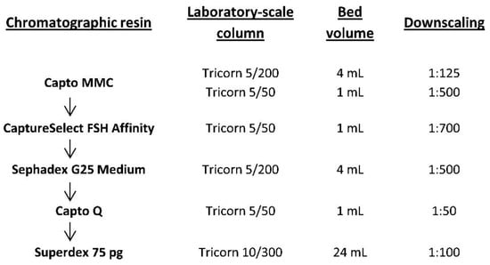 The overall downstream process for the isolation and purification of r-hFSH from culture medium includes the cell removal step (centrifugation/filtration), solvent/detergent viral inactivation step, five column chromatography steps (multimodal, immunoaffinity, desalting by size exclusion, tandem ion exchange, and final size exclusion chromatography), viral filtration step, formulation, and sterile filtration. Figure 1 represents the downscaling for laboratory-scale studies for all five chromatographic purification steps. To evaluate the degradation process of the resin in multiple purification cycles, cycling studies were performed. One chromatographic cycle, including column equilibration, sample loading, column wash, elution of the target protein, column cleaning-in-place (CIP), and sanitization-in-place (SIP), was repeated 40 times for each of the five chromatographic purification steps using a small downscaled column. Dynamic binding capacity (DBC) was also determined for multimodal, immunoaffinity, and ion-exchange chromatography.