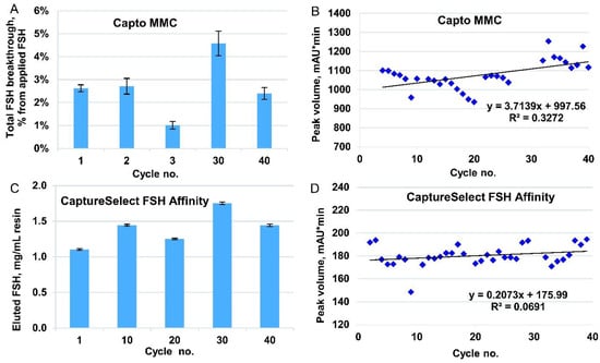 Immunoaffinity resins are often used for purification of recombinant proteins, for example, for the purification of blood clotting factor VIII [41]. The authors of [27] have examined in detail the use of a VIIISelect resin consisting of a camelid-derived 13 kDa recombinant single domain mini-antibody ligand attached to a cross-linked agarose base matrix. The study involved the measurement of the static binding capacity, dynamic binding capacity, product recovery, impurity clearance, and adsorbent reuse. However, similar data were not available for the CaptureSelect FSH Affinity Matrix used in the process described. We determined the DBC10% for the immunoaffinity resin (1.6 mg FSH/mL resin in cycle 1) and studied its behavior in reuse cycles. The increased FSH breakthrough that occurred between the 30th and the 40th cycles indicated that the binding capacity of the resin diminished to some extent after 30 use cycles, and a larger amount of FSH started to appear in the breakthrough (Figure S2). At the same time, until a capacity of 1.0 mg/mL was reached, no detectable amounts of FSH appeared in the flow-through fractions in all cycles (Figure S2). Thus, the change in the shape of the r-hFSH binding curve at the 40th cycle possibly did not indicate a drop in capacity but a change in the additional FSH binding through another mechanism (binding by other functional groups of the resin, not by the antibodies). Therefore, we used another common method to assess the capacity change by evaluating the target protein content in the eluate. The analysis of the eluate showed that the resin capacity remained the same over 40 cycles (Figure 2C,D).