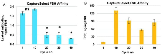 Purity characterization of the immunoaffinity column eluate (CaptureSelect FSH Affinity Matrix). Data for control cycles. (A) Camelid anti-FSH mini-antibodies concentration as measured by enzyme-linked immunosorbent assay (ELISA). (B) Residual host-cell proteins (HCP) concentration as measured by ELISA. All data are mean, error bars represent standard deviation (n = 2). *—p-value < 0.05, ns—p-value > 0.05, unpaired t-test.