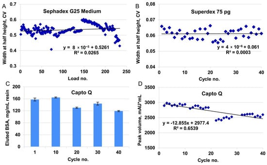 Stability studies for desalting by size-exclusion, ion exchange chromatography, and final size-exclusion chromatography (steps 3, 4, and 5, accordingly). (A) Eluate peak broadening for Tricorn 5/200 column, bed volume 4 mL, Sephadex G25 Medium resin (downscaling 1:500), conductivity channel, 40 cycles, six loads in each cycle. Sample volume 0.75 mL. (B) Eluate peak broadening for Tricorn 10/300 column, bed volume 24 mL, Superdex75 pg resin (downscaling 1:100), absorbance channel at 280 nm, 40 cycles. Sample volume 1 mL. (C) BSA eluted from Capto Q column in control cycles. Tricorn 5/50 column, bed volume 1 mL, Capto Q resin (downscaling 1:50). Loaded 320 mg BSA/mL resin, residence time 1.67 min. BSA content measured by absorption at 280 nm of the collected eluates. (D) Peak volume integration for eluates in working cycles, absorbance channel at 280 nm. Same column as in panel C. Loaded 30 mg BSA/mL resin, residence time 1.67 min.