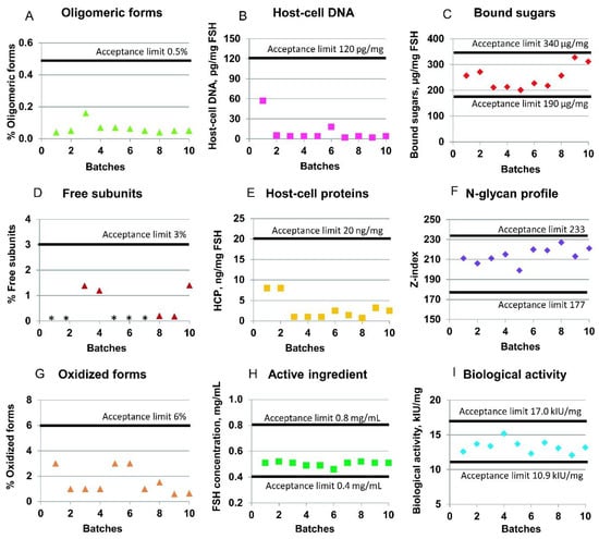 Quality control parameters of the r-hFSH drug substance. (A) Oligomeric forms content; (D) free subunit content; (G) oxidized forms content; (B) host-cell DNA content; (E) host-cell proteins (HCP) content; (H) level of the active ingredient; (C) bound sugars in the r-hFSH molecule; (F) N-glycan profile for r-hFSH; (I) biological activity of r-hFSH in vivo. * Value below the limit of quantification.
