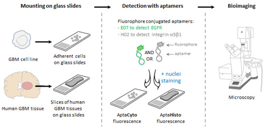 Experimental scheme illustrating the aptafluorescence experiments. After mounting GBM cells or tissues on glass, cells or tissues were incubated with aptamers covalently conjugated to fluorophores. Two aptamers with different specificities were used in this study: aptamer E07 to detect EGFR and aptamer H02 to detect integrin α5β1. At the end of this manuscript, we also describe a technique in which both aptamers were simultaneously incubated on GBM tissues (multiplexing experiments). Fluorescence microscopy was then realized for bioimaging. Drawings are not to scale.