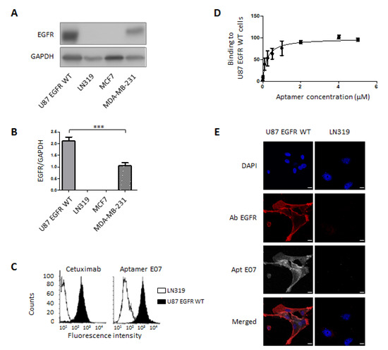 Validation of EGFR expression and E07 aptamer binding to cancer cells. (A,B) Immunodetection of EGFR in different cancer cell lines. (A) Immunoblot showing the expression of EGFR (175 kDa) in U87 EGFR WT, LN319, MCF7, and MDA-MB-231 cell lines. GAPDH (37 kDa) was used as loading control. (B) Quantitative immunoblot analysis. Histograms represent the means ± SDs of three independent experiments normalized to GAPDH, with *** p < 0.005 (non-significant data are not specified). (C,D) Flow cytometry experiments. (C) Left side: Control of EGFR expression via the binding of EGFR antibody Cetuximab conjugated to Cy5 to U87 EGFR WT (black fill) and LN319 cells (black line, white fill). Right side: Comparison of the binding profiles of aptamer E07-Cy5 at 1 µM to U87 EGFR WT cells (black fill) and LN319 cells (black line, white fill). (D) Titration of aptamer E07. Different concentrations of the E07-Cy5 aptamer (0.001, 0.01, 0.1, 0.25, 0.5, 1, 2, 4, and 5 µM) were incubated with a constant number of U87 EGFR WT GBM cells and analyzed using flow cytometry. Titration resulted in the determination of the equilibrium affinity parameter, KD, for the interaction between U87 EGFR WT cells and aptamer E07 (208.7 ± 45.57 nM). (E) Confocal imaging of E07-Cy5 aptamer in two cell lines, LN319 and U87 EGFR WT. Cells were seeded in coverslips and incubated with 100 nM of E07-Cy5 aptamer for 30 min (white). The incubation of antibody anti-EGFR was followed by incubation with a secondary antibody labeled with Alexa 568 (represented in red). Nuclei were stained with DAPI (blue). Scale bar = 10 μm.