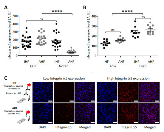 Quantification of integrin α5 expression level in 20 glioblastoma tissues using immunohistofluorescence (IHF) and aptahistofluorescence (AHF). (A,B) Distribution of cumulative data obtained via IHF (black) and AHF (gray) (A) of formalin-fixed paraffin-embedded (FFPE; squares) and frozen (circles) sections and (B) of FFPE sections only, considering samples showing high or low integrin α5 expression levels expressed as arbitrary units (A.U.). Statistical analyses were performed with Student’s t test (**** p < 0.0001; ns, not significant). (C) Representative images of low and high integrin α5 expression staining via IHF and AHF are represented (magnification × 40). The drawings on the left (not to scale) symbolize the detection in tumor sections using IHF (as an indirect method of detection, with Ab 1928 and a fluorophore-conjugated secondary antibody) and AHF (as a direct detection method, with fluorophore-coupled aptamer H02). Integrin α5 labeling is represented in red. Nuclei were stained with DAPI (blue). Scale bar = 50 μm.