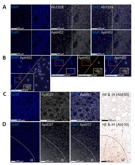 Because of it being a likely major cause of treatment resistance, we then assessed whether intra-tumoral GBM heterogeneity could be detected separately using H02 and E07 aptamers, both of them conjugated to Cyanine 5. The data obtained with aptamers were compared to immunological detection in FFPE tumor sections.