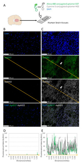 Dual labeling with aptamers targeting integrin α5 and EGFR. (A) Schematic depicting detection via AHF simultaneously using two aptamers, aptamers E07 and H02, conjugated to two different fluorophores (not to scale). In (B,C), we show human epileptic brain and GBM tissues, respectively. DAPI staining is shown in blue. Detection of EGFR with Alexa 488-conjugated aptamer E07 is represented in green. Detection of integrin α5 with Cyanine5-conjugated aptamer H02 is represented in gray. Images in (B,C) were captured using the same settings to allow us to perform a direct comparison of the staining intensity with a Nanozoomer S60 slide scanner. Scale bar = 100 μm. (D,E) Histograms of normalized fluorescence intensities corresponding to detection with aptamers E07 (in green) and H02 (in gray). Histograms in (D,E) correspond to the fluorescence intensities of B and C, respectively, quantified along the orange diagonal arrow. Histograms show only sparse fluorescence in epileptic tissue (D); they show, in GBM tissue (E), that areas were not uniformly labeled with both aptamers. For example, the gray arrow in (E) shows an area strongly and faintly labeled with aptamers H02 and E07, respectively. This area corresponds to the cells pointed at by the gray arrow in (C).
