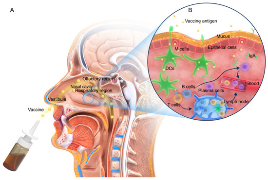 The respiratory system in mammals performs the essential physiological function of the exchange of gases between the organism and the environment. As a consequence, the respiratory system inevitably encounters infections with various foreign pathogens [1], such as the new severe acute respiratory syndrome coronavirus (SARS-CoV-2), which is transmitted mainly via the respiratory tract, was responsible for the pandemic that began at the end of the year 2019, and has emerged as a serious threat to public health. Vaccination is one of the most effective immunological approaches currently available for enhancing the lifespan and quality of health in humans. The conventional mode of vaccination is immunization through an injection. However, this dates back to the 10th century AD in China, in which the scabs on the rashes of smallpox patients were crushed into powder and blown into the nostrils of healthy individuals for vaccination against the smallpox [2]. In the recent history of vaccine development, many clinical trials have been conducted on respiratory mucosal vaccines. The nasal route of vaccination prevents the hepatic first-pass effect and/or gastrointestinal decomposition, while only little enzymatic degradation of the vaccine antigens occurs in the nasal cavity, thereby requiring a lower dose of antigens compared to the parenteral and oral routes of immunization [3]. In addition, nasal mucosal vaccination reduces syringe usage and medical waste, due to which it is regarded as a resource-saving and environment-friendly strategy suitable for a sustainable healthcare model. Moreover, the mucosal vaccines are convenient for use as self-help vaccination, which ensures the comfort of individuals and enhances individuals compliance, thereby being suitable for mass vaccinations in the general population [4]. Since nasal mucosal vaccines have the potential to induce heightened protective immune responses at the primary site of pathogen infection, including the secretion of antibodies and tissue-resident T cell responses, these vaccines allow for blocking the epithelial cells and other cells to pathogen infection, thereby preventing the infection during the beginning stages rather than only reducing infection in later stages and preventing the further development of disease symptoms [5,6]. Meanwhile, nasal mucosal immunization has also been demonstrated to be ideal for SARS-CoV-2 vaccination [7].