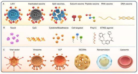 The different types of nasal vaccines and adjuvants. (A) The subtypes of nasal vaccines. (B) The subtypes of immune enhancement adjuvants. (C) Adjuvant delivery system.