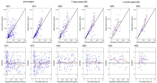 Goodness-of-fit plots for the final model at each visit: (a1,a2,a3) observations versus population predictions (PRED); (b1,b2,b3) observations versus individual predictions (IPRED); (c1,c2,c3) conditional weighted residuals (CWRES) versus PRED; (d1,d2,d3) CWRES versus time after dose.