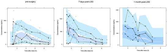 Obese patients received a single 20 mg oral dose of omeprazole enteric-coated capsules under fasting conditions 2–3 days before surgery. Subsequently, 20 mg omeprazole was orally administered once daily to relieve gastrointestinal symptoms from the 7th day after LSG to 1 month after LSG. Consequently, this PK study was performed three times: after a single dose before surgery (visit 1), after a single dose 7 days post-LSG (visit 2), and after a repeated dose 1 month post-LSG (visit 3). Blood samples were obtained at approximately 1, 2, 4, 6, 8, and 9 h after omeprazole intake. The majority of patients had three blood samples collected before surgery, three collected 7 days after LSG and two collected 1 month post-LSG. Blood samples were centrifuged for 10 min at 4 °C at 2500× g, after which plasma was stored at −80 °C until analysis. Plasma samples were analyzed using a validated liquid chromatogram tandem mass spectrometry method []. The lower limit of quantification of this assay was 1 ng/mL, and the upper limit of quantification was 2000 ng/mL. The quality control samples demonstrated that the intra-day and inter-days coefficients of variation were less than 10%.