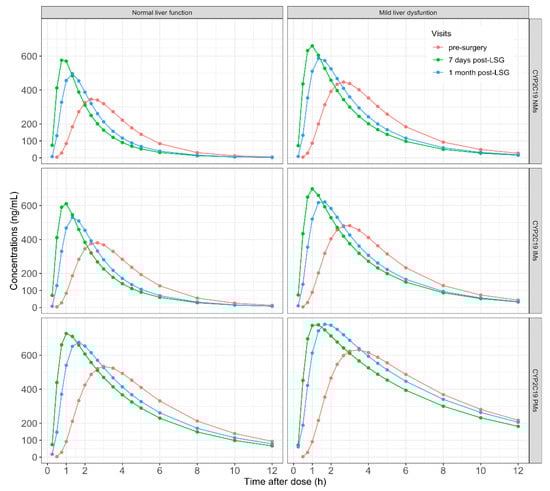 Mean concentration–time curves of omeprazole based on 1000 simulations stratified by liver function and CYP2C19 genotype in obese patients undergoing LSG.