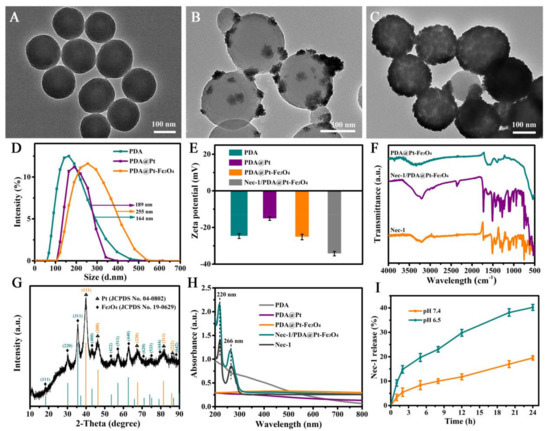 The TEM images of (A) PDA nanoparticles, (B) PDA@Pt nanoparticles, (C) PDA@Pt-Fe3O4 nanoparticles. (D) The dynamic light scattering of PDA, PDA@Pt, and PDA@Pt-Fe3O4 nanoparticles, respectively. (E) The zeta potential of PDA, PDA@Pt, PDA@Pt-Fe3O4, and Nec-1/PDA@Pt-Fe3O4 nanoparticles, respectively. (F) FTIR spectra of the PDA@Pt-Fe3O4, Nec-1/PDA@Pt-Fe3O4, and free Nec-1. (G) XRD pattern of the PDA@Pt-Fe3O4. (H) UV-Vis-NIR spectra of the aqueous solutions of PDA, PDA@Pt, PDA@Pt-Fe3O4, Nec-1/PDA@Pt-Fe3O4, and free Nec-1. (I) Cumulative Nec-1 release of the Nec-1/PDA@Pt-Fe3O4 nanoparticles in PBS at pH 6.5 and 7.4.