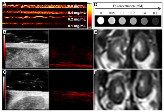 To explore the PA performance of Nec-1/PDA@Pt-Fe3O4, we used a variable wavelength pulsed laser (680–970 nm) and an input laser with a frequency of 30 MHz. The results showed that PDA@Pt-Fe3O4 exhibited extremely strong PA signal intensity, and the intensity of the photoacoustic signal increased with PDA@Pt-Fe3O4 concentration (Figure 3A) possibly because of the PA-enhancing effect of PDA [23]. In addition, the photoacoustic image of mouse kidneys before and after injection of 100 μL Nec-1/PDA@Pt-Fe3O4 at a concentration of 1 mg/mL was investigated. The results are shown in Figure 3B,C. After the injection of nanoprobes, the photoacoustic signal of blood vessels in the renal region was significantly enhanced, and the renal contour became clear, indicating that Nec-1/PDA@Pt-Fe3O4 had an excellent performance in PA images.