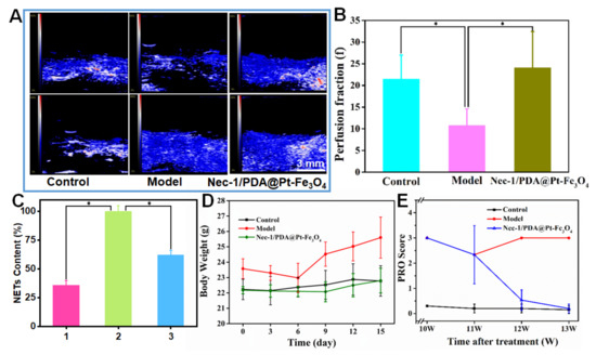 (A) Blood oxygen graph of mouse photoacoustic tomography. (B) Comparison of iVIM-DWI sequence renal perfusion scores in different groups of mice. Data are presented as the mean ± SD. * p < 0.05 vs. the model group. (C) The percentage content of NETs released by a neutrophil. 1 represents neutrophil control group; 2 represents neutrophil + PMA; 3 represents neutrophil + PMA + Nec-1/PDA@Pt-Fe3O4. Data are presented as the mean ± SD. * p < 0.05 vs. the neutrophil + PMA group. (D) Body weight and (E) PRO content change before and after Nec-1/PDA@Pt-Fe3O4 treatment.