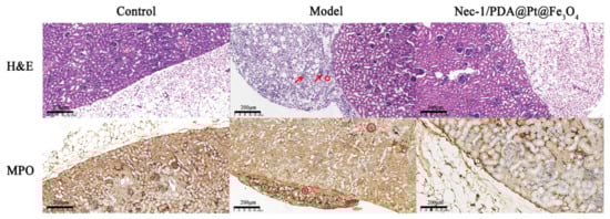To further test the therapeutic efficacy of the Nec-1/PDA@Pt-Fe3O4 for LN, we performed a pathological examination on the kidneys of the mice. The kidneys were sectioned and stained with H&E and MPO. As shown in Figure 5, H&E staining showed numerous neutrophils and lymphocytes that infiltrated the renal cortex, indicating severe kidney inflammation. In the control and drug groups, clear infiltration around the renal cortex without inflammatory cell infiltration was observed, demonstrating that Nec-1/PDA@Pt-Fe3O4 reduced inflammation and then ameliorated LN. MPO staining showed similar results. Neutrophils and some lymphocytes were observed around the renal cortex in the model group. In the control and drug groups, neutrophils and some lymphocytes around the renal cortex markedly decreased, showing that Nec-1/PDA@Pt-Fe3O4 can reduce inflammation. In general, these results suggested that Nec-1/PDA@Pt-Fe3O4 can ameliorate LN.