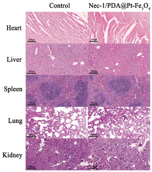 Mice were randomly divided into the experimental group and the control group, and the experimental group was injected with Nec-1/mPDA@Pt-Fe3O4 (1mg/mL, 6mg/kg/d Necrostatin-1 equiv.) via the intraperitoneal injection, and the control group was injected with saline (100 mL). The hearts, livers, spleens, lungs, and kidneys of the mice were collected for histological analysis.