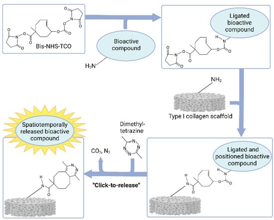Schematic representation of the functionalization of the bis-N-hydroxysuccinimide (NHS)-functionalized TCO molecule (bis-NHS-TCO) with an amine-containing bioactive compound, followed by conjugation to a collagen scaffold and subsequent spatiotemporal release of the bioactive compound after “clicking” the bis-NHS-TCO with dimethyl-tetrazine. Created with BioRender.com.