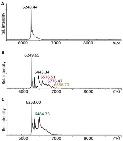 The samples were thawed and diluted to 10 and 1 μM of hEGF in H2O in a total volume of 5 μL. This mixture was added to an equal volume of a standard α-cyano-4-hydroxycinnamic acid (CHCA) matrix solution (H2O:acetonitrile 1:1 + 0.1% formic acid). An initial layer of CHCA solution was applied on the MALDI plate (stainless ground steel 96/12, Bruker Daltonics GmbH & Co., KG, Bremen, Germany), onto which the samples were spotted. The mass spectra of intact proteins were analyzed by MS (Bruker Microflex LRF MALDI-TOF system). The MS data were annotated employing FlexAnalysis software (Bruker).