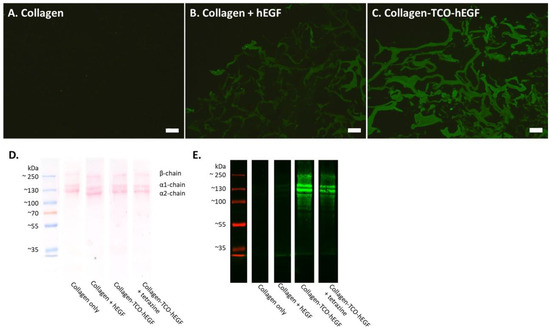 Successful immobilization of hEGF–TCO to collagen scaffolds. Immunofluorescent detection of hEGF on collagen scaffold cryo-sections (A–C) and Western blotting (D,E). (A) Negative control of collagen scaffold without hEGF, (B) collagen scaffold incubated with hEGF only, and (C) collagen scaffold conjugated with hEGF–TCO. Scale bar = 50 μm. Green color indicates hEGF. All images were acquired under identical exposure time and laser intensity. (D) Total protein load of Western blot of collagen scaffolds is visualized by Ponceau S. (E) Western blot of collagen scaffolds, where hEGF is indicated by the green signal. Pre-stained marker stains red under these conditions.
