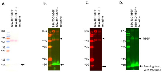 On the Ponceau S stain, protein bands were located at the predicted height of BSA at 66.5 kDa and in the running front where free hEGF at 6.2 kDa is located (Figure 4A). After the removal of Ponceau S, the blot was immunolabeled for both BSA and hEGF (Figure 4B–D). The combined channels showed that hEGF is located slightly above the band belonging to BSA. This shift is due to the size difference caused by the ligation of hEGF to BSA (6.22 + 66.5 kDa). When separating the channels (Figure 4C), there is no BSA-specific signal at this protein band, which can be explained by the monoclonality of the BSA antibody, which may not recognize the BSA antigen when its binding site is blocked by the hEGF–TCO complex.