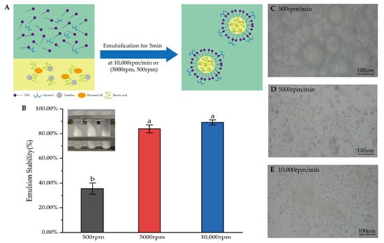 (A) Diagram of the preparation of the emulsion. (B) Results of accelerated emulsion stability and experimental figure at shear speeds of 500 rpm, 5000 rpm and 10,000 rpm. The data are means ± SD (n = 3). Means with different letters (a,b) are significantly different (p < 0.05) via Duncan’s test. (C–E) Microphotographs of emulsions were mixed at 500 rpm, 5000 rpm and 10,000 rpm.