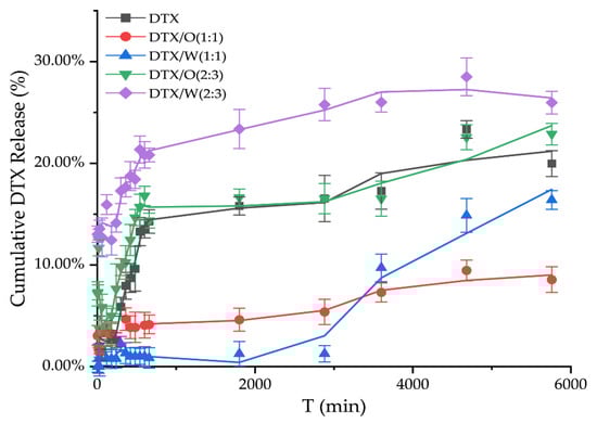 The release of DTX solution was only more than 20%, which may be due to the fact that DTX solution does not create a leaky tank condition with the receiving solution in the below compartment, thus making the release of DTX difficult to detect (Figure 4). In addition, when the dosage of stearic acid to Vaseline was 2.5 g and 2.5 g (1:1) in a 10 mL system, only a small amount of DTX was released from DTX-containing emulsions in vitro. Although DTX/O (1:1) and DTX/W (1:1) suddenly released at 60 h, especially DTX/W (1:1), the in vitro total release of DTX from DTX/W (1:1) did not exceed 20% in 96 h, and DTX/O (1:1) was only half of DTX/W (1:1). However, after changing the ratio of stearic acid and Vaseline to 2:3 and adding flaxseed oil, the release of DTX from both DTX/W (2:3) and DTX/O (2:3) reached 20.82 ± 1.67 and 14.37 ± 1.73% within 12 h. Then, in the next 72 h, an additional 5~8.5% of DTX was sustained and slowly released, which could be attributed to the dissolution of DTX existing on the surface of the emulsion [11]. In addition, these results are in accordance with the study by Zhang et al. [17], who reported that DTX was lipid friendly and could easily be encapsulated in the oil phase, making it difficult to “detach”. On the other hand, DTX was freely distributed in the water phase and was weakly limited by oil phase components [14].