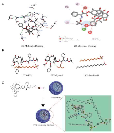 It has been proved theoretically that docetaxel has good docking performance with β-tubulin [41]. Therefore, we also conducted a docking model of β-tubulin with DTX (Figure 5A). DTX kept a conventional hydrogen bond with amino acid residue Arg278 of β-tubulin, and hydrophobic interactions were generated with Val23, Pro360, and Leu371. In addition, it formed a mainly unfavorable bump with Arg369, His229, and Asp226. Due to different in vitro release studies of DTX/O and DTX/W, the interaction forces between the prescription components were analyzed. DTX could form hydrogen bonds with SDS and glycerol. SDS could form ionic bonds with stearic acid (Figure 5B). The interaction forces between the remaining molecules were mainly Van der Waals forces. These also showed that the structure of emulsion was stable, and there was the possibility of a slow release during the in vitro release process. As a result, we speculated on the chemical structure distribution of DTX in the oil-in-water-type emulsions, as described in Figure 5C.